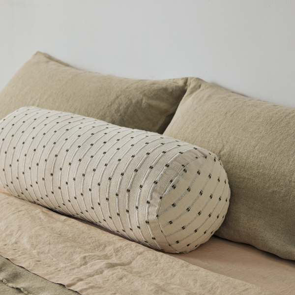 Organic Textured Cotton Bolster Cushion Cover in Off White with Olive